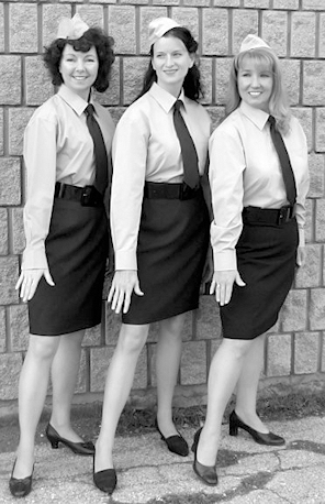 Campbell was a natural choice for composing the jingles. In the summer, word hit the grapevine that there was a great performance of Boogie Woogie Bugle Boy at Petrolia’s Art In the Park. When play director Richard Teskey got wind of it, he asked all three to be The Andrew Sisters in the production. Then he learned that Kristina was already singing and writing songs for the alternative folk rock band, Ellis Ave. That’s when he offered her the challenging task of composing the jingles for the play. The music had to be good, it had to have an authentic 1940s sound and it had to advertise three real Petrolia businesses – Grandis Jewellers, Lilith lingerie and VanTuyl and Fairbank Solarware.