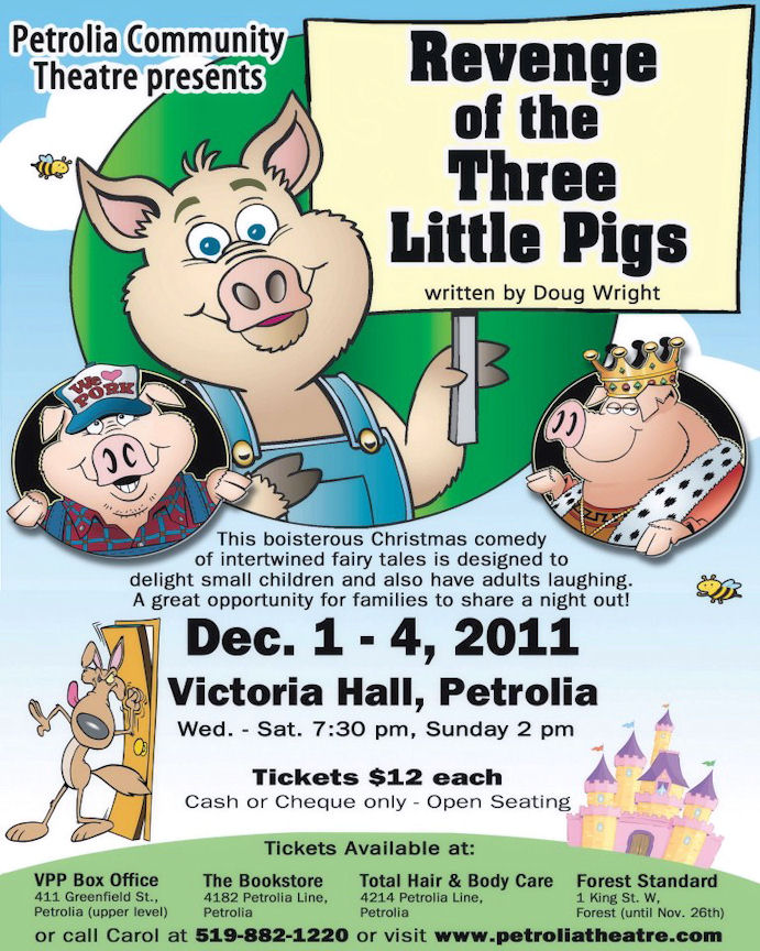 The Petrolia Community Theatre presents a new Christmas Comedy, “Revenge of the Three Little Pigs”, by Doug Wright. It’s a hilarious look at your favourite storybook characters in a boisterous, colourful tale. This is a lively comedy for people of all ages with plenty of physical escapades for youngsters as well as political and local humour for adults.