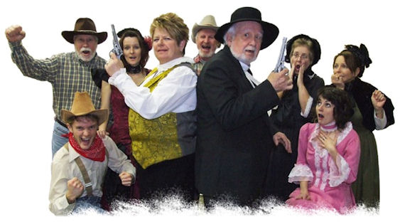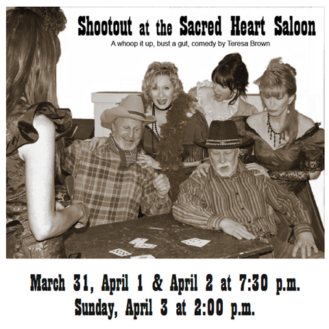 Set in the 1800’s, a remote town out west somewhere. Summer. The play opens with a bar room brawl complete with breaking furniture and someone going through the window! The whoop-it-up western comedy has it all: flirty saloon girls, fighting cowboys, and a honky tonk piano player. It also has a nervous Preacher, some feisty church ladies and a shootout!